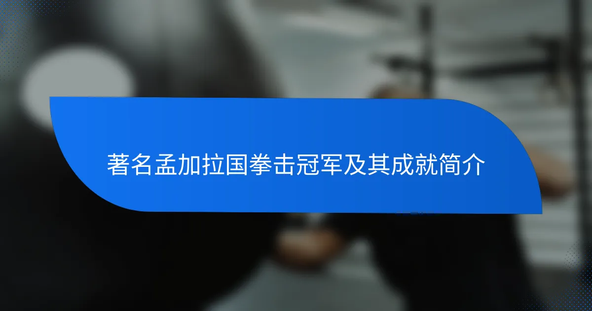 著名的孟加拉国拳击冠军包括几位对这项运动做出重大贡献的运动员,他们展现了非凡的才能和决心。这些冠军不仅取得了个人成功,还激励了孟加拉国新一代拳击手。